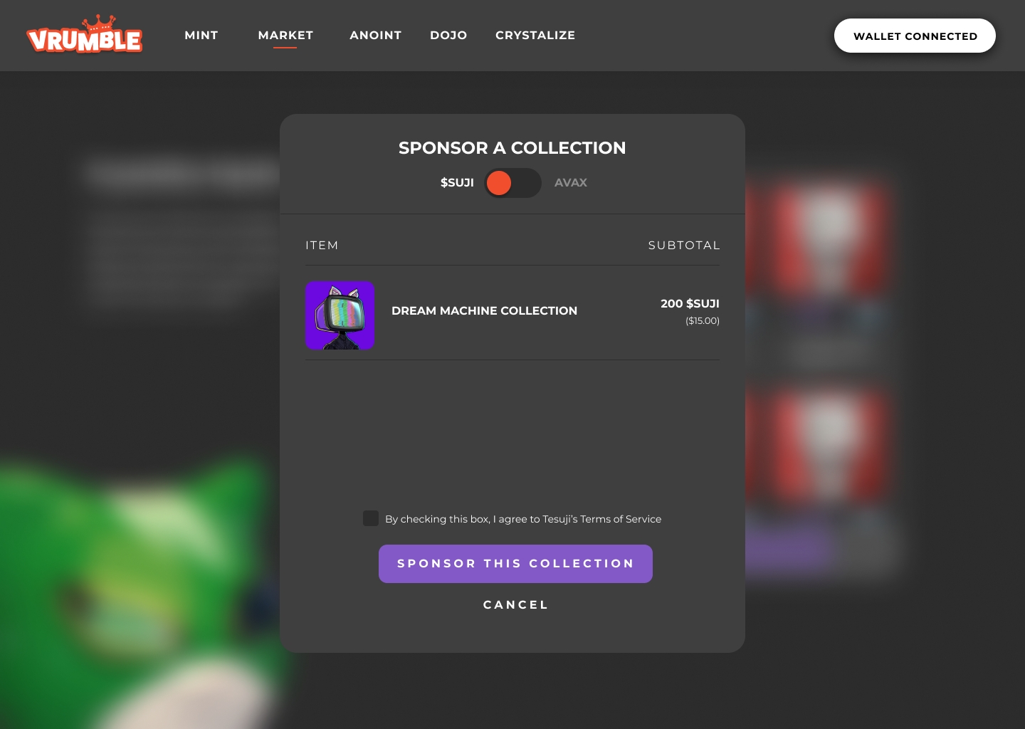 First things first - Anointing... what does it mean? It means that you can take your NFT , from some chain, from some collection/contract address and anoint it. This gloms/attaches mystical powers as a record on-chain (Avalanche) that is linked to your NFT. These powers - the Mystic Info is then fetch-able for all the games that you use your Anointed NFT in. Types of Mystical Powers: Earth, Aether, Fire, Water, Shadow, Moon, Sun To anoint an NFT you have to BURN a Rift Sparkle. Watch the video to learn How to Anoint NFTs you already own into Vrumble so you can battle them. Rift Sparkles are generated through: 1. Supply Cap of 1000 per week with that amount slowly diminishing over time. These can be purchased with SUJI or with AVAX during initial sales window, then just SUJI after that. 2. Through Crystallization (combination of multiple Anointed NFTs into summoning a new Rift Sparkle) 3. Through Sponsorship.