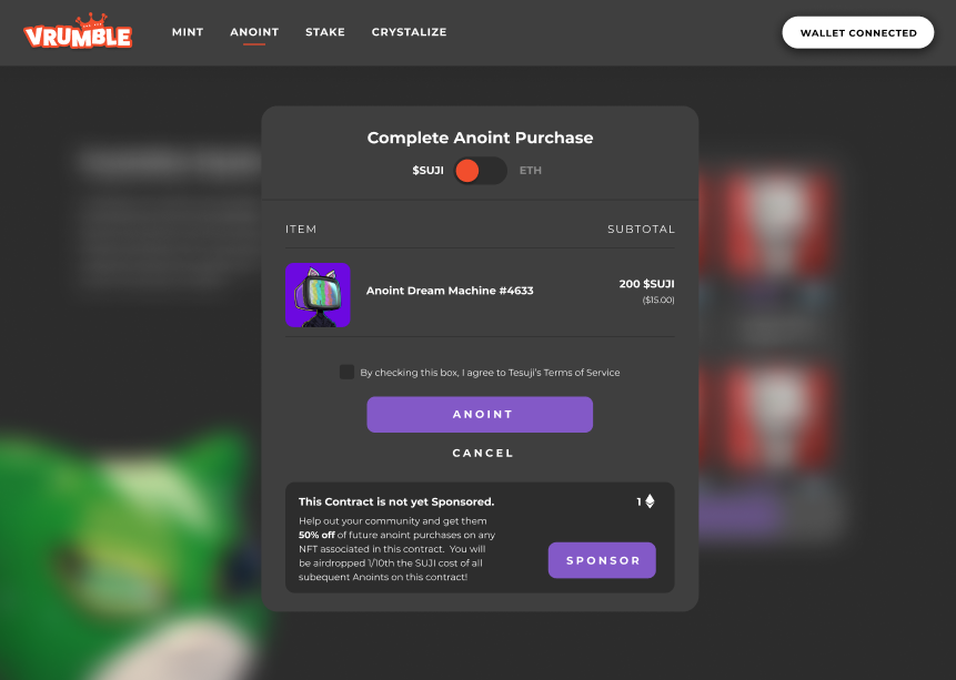 Our Anointing happens on Avalanche C-Chain (main net): 1. Purchase a Rift Sparkle from our marketplace (or another NFT market place). We mint a varied amount per week. or Utilize a RiftSparkle that was airdropped to you (from a sponsorship or other source) and on our Anoint website (make sure to connect to Avalanche Main Net!): https://www.vrumble.io/anoint 2. Then on that page: make sure to connect the account that has the NFT's you want to Anoint. Perhaps they are from ETH main net? Connect your Meta mask with your Ethereum main network Perhaps they are from Solana main net? Connect your Phantom wallet with Vrumble website... This is all so that the vrumble.io/anoint site can find all your NFTs and list out which ones you want to anoint. 3. Then select NFT's you want to anoint. Pay the AVAX/SUJI on the transaction and now your NFTs are anointed!! 4. Check them out at https://www.vrumble.io/my-mystics 5. With your NFT's now anointed you can use them for various ON-CHAIN games.