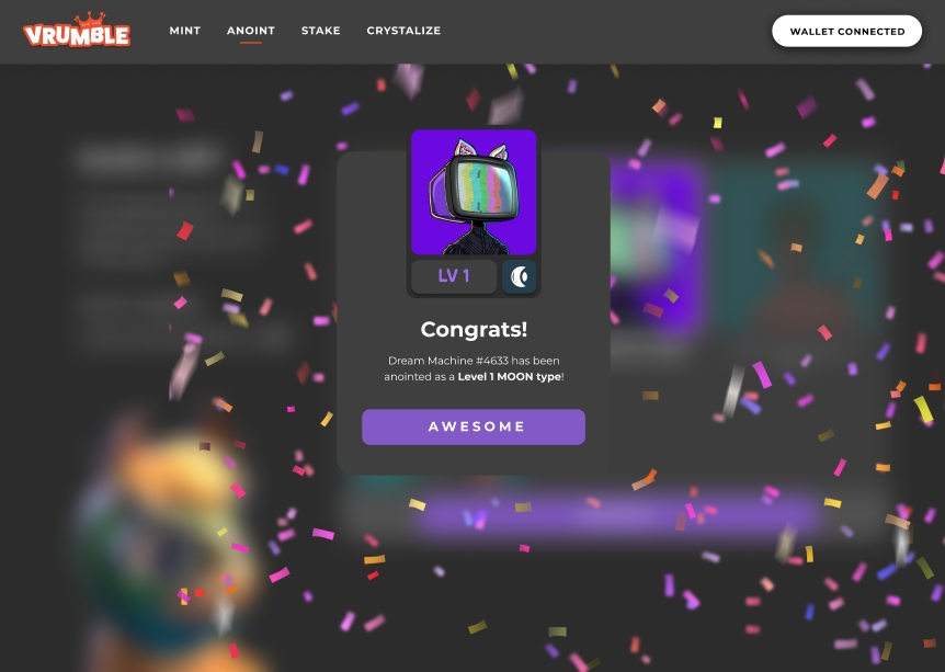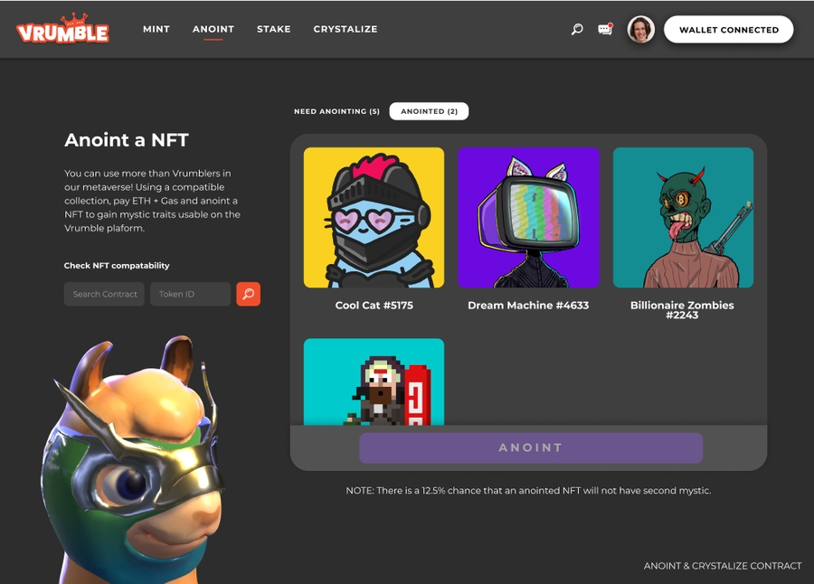 The whole goal of Vrumble is to let players take their NFTs that they own - ANOINT them, giving them MYSTIC POWERS on CHAIN - and then with their newly anointed NFT - battle them in our Vrumble Arenas.