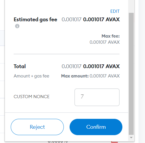 6. Make a new transaction to your own address, sending 0 AVAX and use the same nonce that you got from step 4. Use the exact same nonce as the pending transaction, with a higher gas fee than the transaction that is pending.